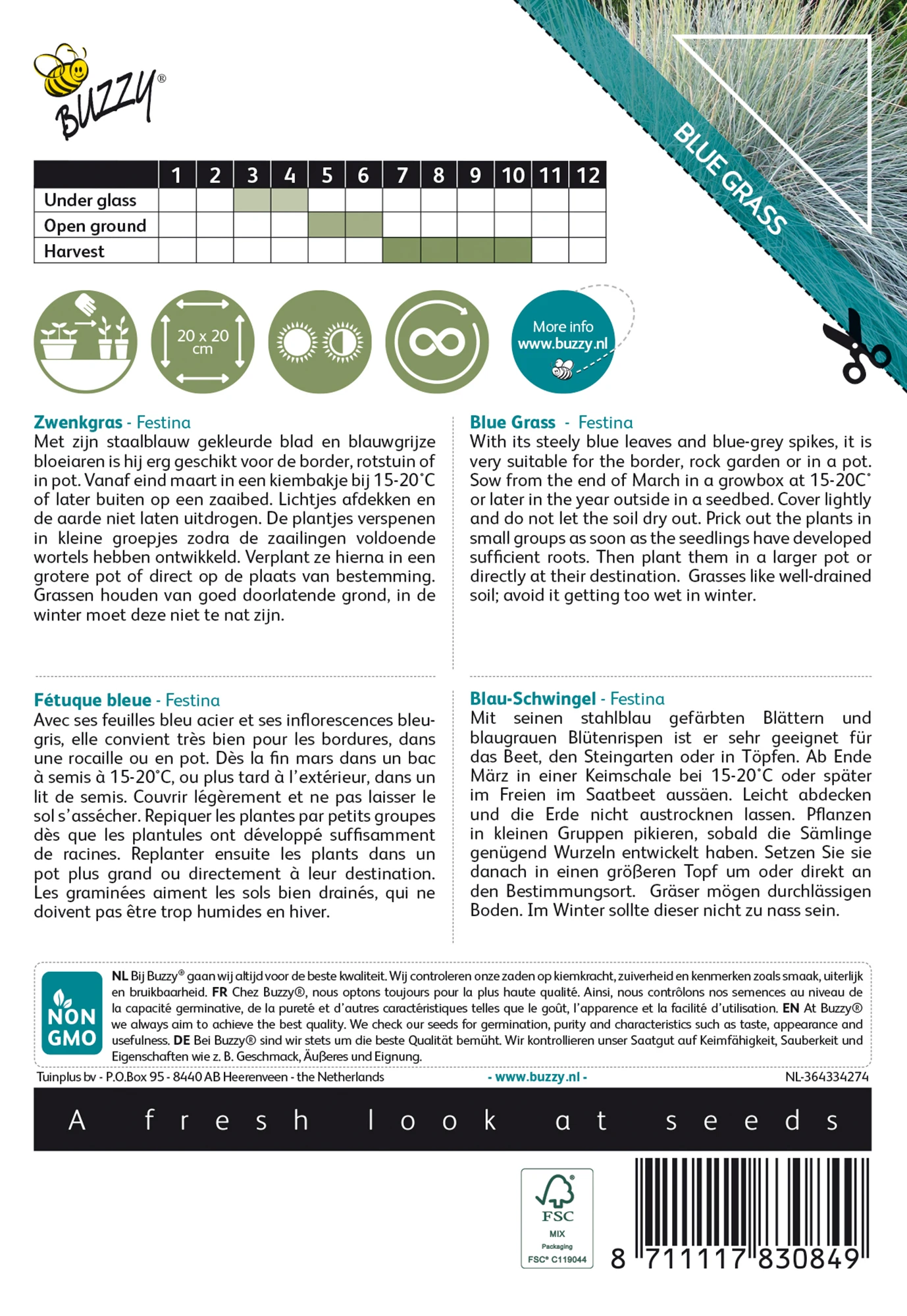 Mit seinen stahlblau gefärbten Blättern und blaugrauen Blütenrispen ist er sehr geeignet für das Beet, den Steingarten oder in Töpfen. Ab Ende März in einer Keimschale bei 15-20°C oder später im Freien im Saatbeet aussäen. Leicht abdecken und die Erde nicht austrocknen lassen. Pflanzen in kleinen Gruppen pikieren, sobald die Sämlinge genügend Wurzeln entwickelt haben. Setzen Sie sie danach in einen größeren Topf um oder direkt an den Bestimmungsort. Gräser mögen durchlässigen Boden. Im Winter sollte dieser nicht zu nass sein.