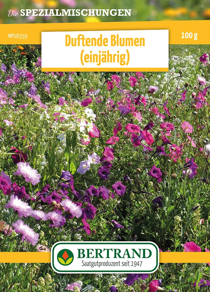 Diese schöne Mischung vereint Blumen, die sich durch die Kraft ihres Duftes auszeichnen, wie z.B. die Abendblume (Matthiola incana), nach Honig duftender Alyssum, süß duftende Reseda, Nelken, Petunie, Zuckererbse, Ziertabak, Eisenkraut… für die Freude der Augen und des Geruchssinnes!