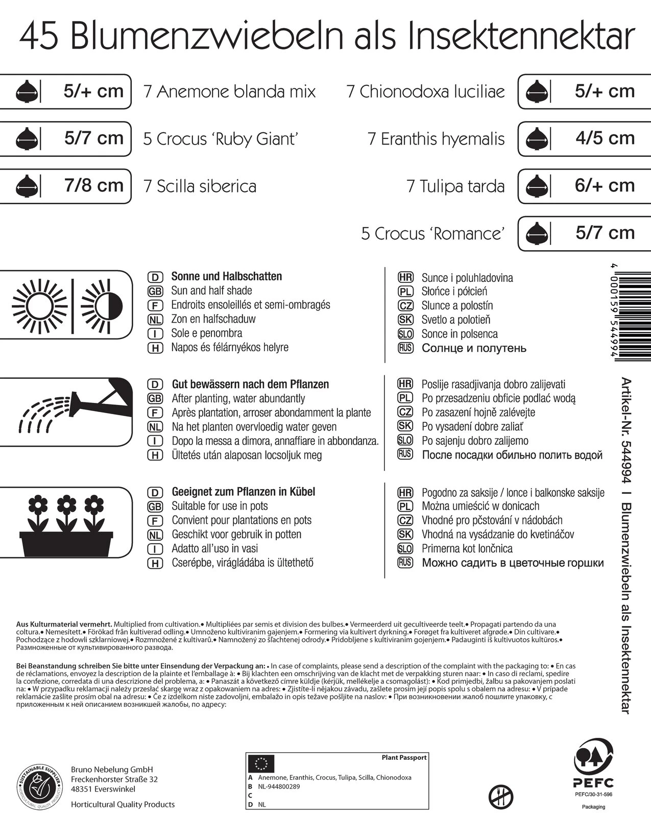 Werden Sie aktiv für unsere Natur und erschaffen Sie mit dem Blumenzwiebel-Mix Colour Symphony „Bienenparadies“ eine Oase für Bienen und andere nützliche Insekten! Diese Mischung aus Tulpen, Anemonen, Krokussen, Blausternen und Sternhyazinthen blüht von Februar bis April und dient Bienen, Hummeln, Schmetterlingen und anderen Insekten als erste, wichtige Nahrungsquelle im Jahr. Durch ihre kompakten Wuchshöhen, die zwischen 10 und 25 cm variieren, können die mehrjährigen und winterharten Blumen auch in Gefäßen kultiviert werden. Im Halbschatten fühlen sie sich besonders wohl. Insgesamt sind 45 Blumenzwiebeln enthalten, was eine üppige Begrünung ermöglicht.