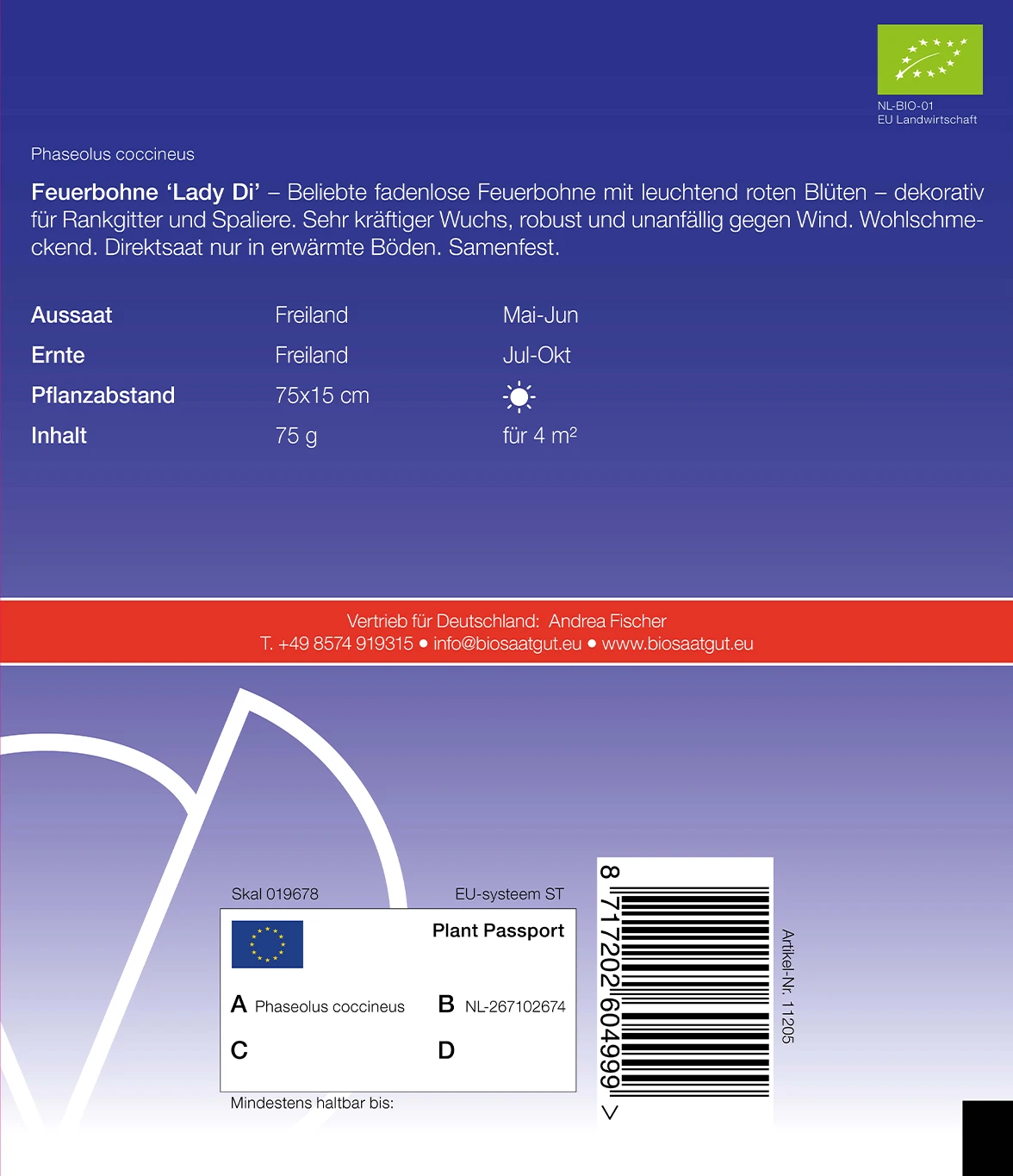 Beliebte fadenlose Feuerbohne mit leuchtend roten Blüten – dekorativ für Rankgitter und Spaliere, Sehr kräftiger Wuchs, robust und unanfällig gegen Wind. Wohlschmeckend. Direktsaat nur in erwärmten Böden. Samenfest.