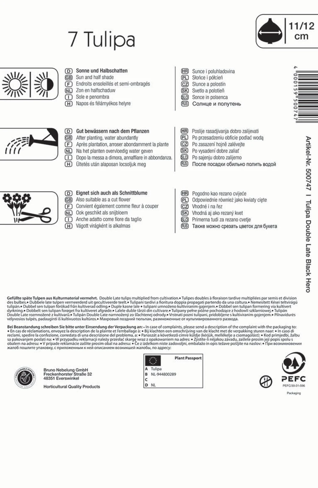 ‚Black Hero‘ ist eine außergewöhnliche Tulpe, die ihre Eleganz aus den purpur-schwarzen Blüten zieht. Diese verleihen jedem Gartenbeet eine nahezu mystische Atmosphäre und sind auch in der Vase ein echtes Highlight. Zu bestaunen sind die gefüllten Blüten im Mai an ca. 50 cm hohen Stielen. Bei ‚Black Hero‘ handelt es sich um eine Profi-Line-Sorte, die zuverlässig und ausdauernd an sonnigen bzw. halbschattigen Plätzen im Garten gedeiht.