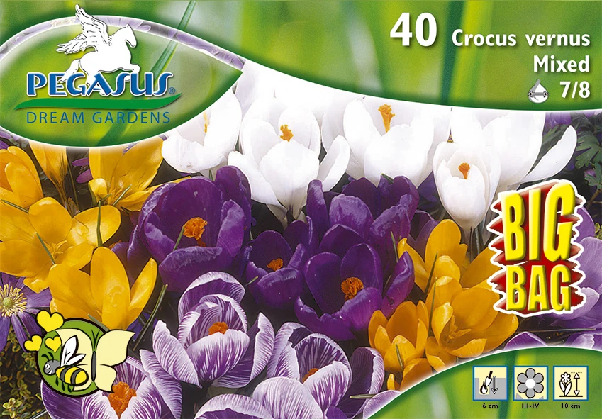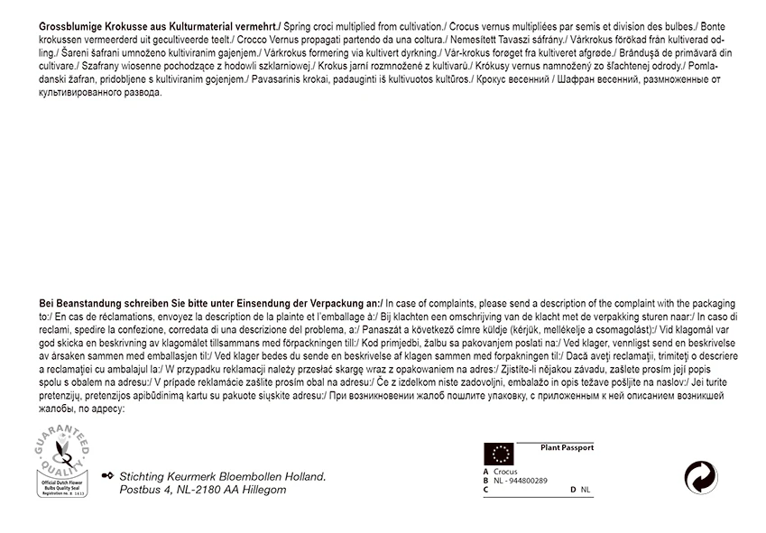 Großblumige Krokusse in einer Farbkombination aus Weiß, Gelb und Lila. Ideale Nahrungsquelle für verschiedene Nützlinge. Falls Sie Ihre Blumenzwiebeln in Kübeln oder anderen Gefäßen pflanzen, dann sollten Sie folgendes beachten. Nach dem Setzen der Zwiebeln das Pflanzgefäß gut angießen und geschützt an der Hauswand, in der kalten Garage o.ä. oder unter Sträuchern im Garten überwintern. Die Zwiebeln benötigen zwingend eine Kühlphase, um blühfähige Blüten zu entwickeln. Nur bei Frösten unter – 10° C sollte zusätzlicher Winterschutz gegeben werden. Ab Mitte – Ende März die Gefäße aus dem Winterquartier holen und ins volle Licht stellen.