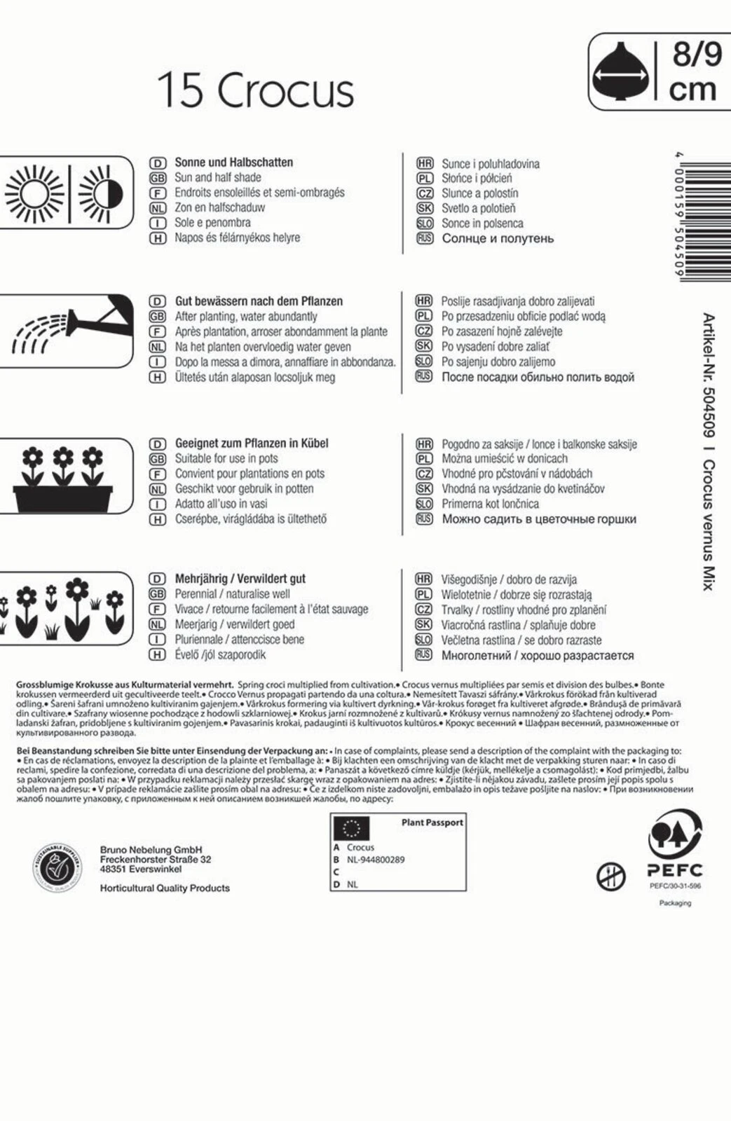 Mit einer Kombination der Farben Weiß, Gelb und Lila wird Sie die großblumiger Krokus-Mischung erfreuen. Die frühblühenden, mehrjährigen Blumen sind nicht nur wunderschön, sondern stellen auch eine wichtige Nahrungsquelle für die fleißigen Nützlinge der Natur dar. Die verwildernden Blumen können auch in Kübeln oder anderen Gefäßen gepflanzt werden. Als Frühblüher benötigen die Blumenzwiebeln zwingend eine Kühlphase, um ihre prächtigen Blüten blühfähig herauszubilden. Sie können geschützt an der Hauswand, in der kalten Garage oder anderen kalten Räumen sowie im Garten unter Sträuchern überwintert werden. Ein zusätzlicher Winterschutz sollte lediglich bei Frost unter -10° C gegeben werden. Zum ersten Mal werden die Gefäße ab Mitte bis Ende März aus ihrem Winterquartier geholt. Dann können sie ins volle Licht gestellt und in ihrer Blüte bewundert werden.