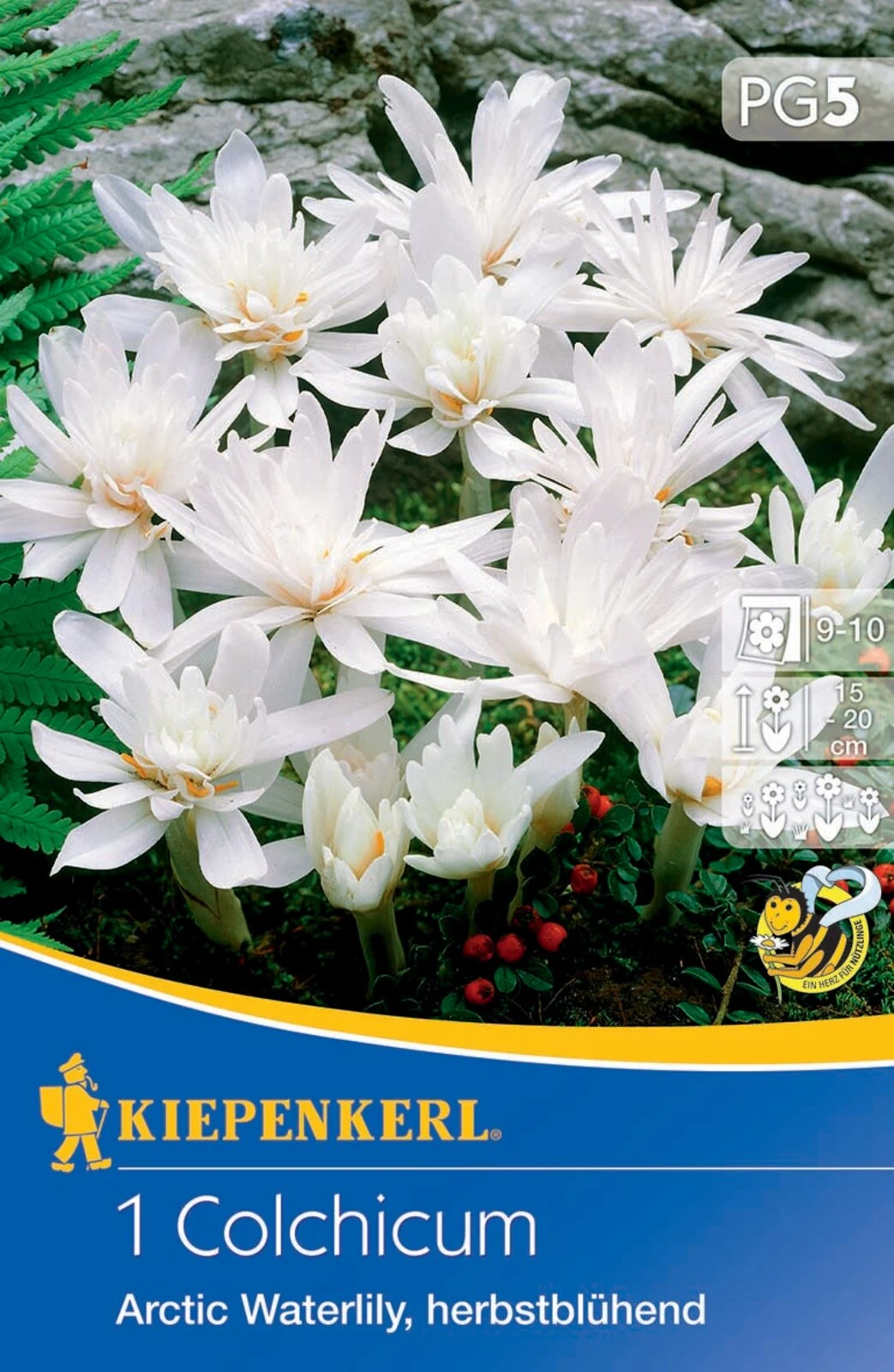 Die Herbstzeitlose ‚Arctic Waterlily‘ bildet von Ende September bis Ende Oktober große, schön gefüllte schneeweiße Blüten, die an Seerosen erinnern. Gerade im Herbst, wenn viele andere Blumen am Verblühen sind, stellen die strahlend weißen Blüten einen echten Blickfang dar. Die 15 bis 20 cm hohen Pflanzen sind winterhart und mehrjährig. Wachsen sie ungestört, verwildern sie hervorragend. An sonnigen bis halbschattigen Standorten fühlen sich Herbstzeitlose besonders wohl. Bienen und Hummeln freuen sich auf ihren späten Flügen über den wertvollen Nektar und Pollen.