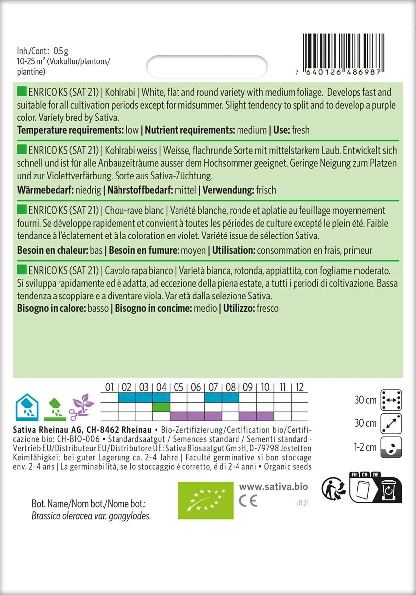 Weisse, flachrunde Sorte mit mittelstarkem Laub. Entwickelt sich schnell und ist für alle Anbauzeiträume ausser dem Hochsommer geeignet. Geringe Neigung zum Platzen und zur Violettverfärbung.