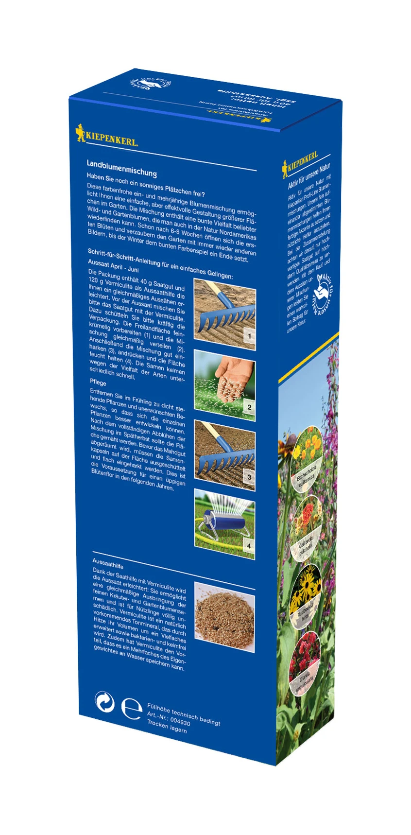 Bunte Blütenpracht für einen Sommer voller schöner Emotionen. Wuchshöhe 40-120 cm Farbenfrohe ein- und mehrjährige Blumenmischung Blüht schon nach wenigen Wochen bis zum Frost Diese farbenfrohe ein- und mehrjährige Blumenmischung ermöglicht Ihnen eine einfache, aber effektvolle Gestaltung größerer Flächen im Garten. Die Mischung enthält eine bunte Vielfalt beliebter Wild.- und Gartenblumen, die man auch in der Natur Nordamerikas wiederfinden kann. Schon nach 6-8 Wochen öffnen sich die ersten Blüten und verzaubern den Garten mit immer wieder anderen Bildern, bis der Winter dem bunten Farbenspiel ein Ende setzt. Unsere speziellen und vielseitigen Blumenmischungen bestehen aus 40 g hochwertigem Blumensaatgut und 100 g Aussaathilfe.