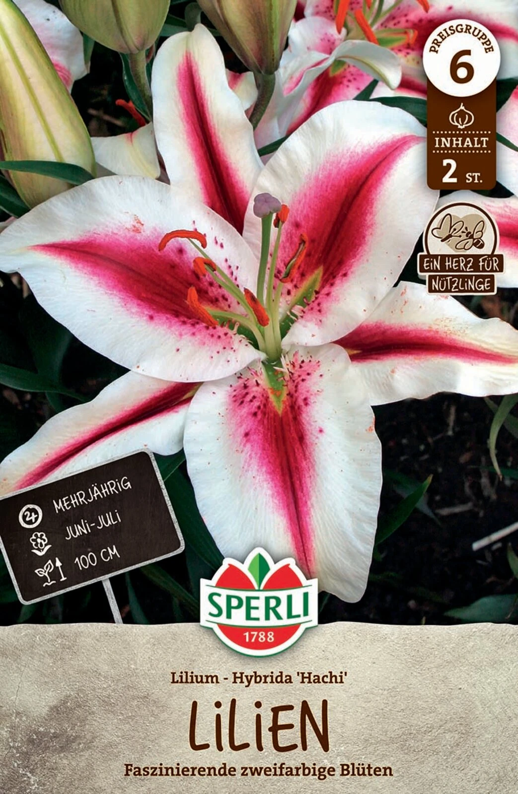 Die großen Blüten der Oriental-Lilie ‚Hachi‘ sind ein echter Blickfang in Beeten und Kübeln. Der breite rosa-weiße Rand steht in spannendem Kontrast mit der rot-purpurnen Mitte der Blüten. Da diese Sorte nur 60-80 cm groß wird, ist ‚Hachi‘ kübelgeeignet. Während der Blühzeit im Juni und Juli lockt die Sorte Insekten in Deinen Garten, denn die Blüten enthalten wertvolle Insektennahrung. Doch diese Oriental-Lilie beeindruckt nicht nur durch ihre Schönheit: Sie duftet auch ganz herrlich intensiv! Da sie für den Vasenschnitt geeignet ist, kannst Du mit dem Stauß Farbe in Deine vier Wände zaubern.
