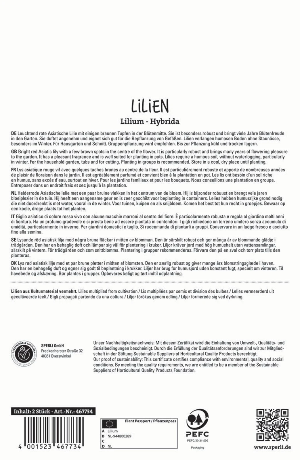 Die Asiatische Lilie ‚Pearl Loraine‘ wird Dich durch ihre vielen Blüten verzaubern. Bei einer Wuchshöhe von 100 cm kommen die spannenden, leuchtend-roten Blüten gut zur Geltung. Diese Sorte ist nicht duftend. ‚Pearl Loraine‘ ist daher auch für alle geeignet, die weniger Freude an süßen, schweren Düften haben. Diese Lilie ist nicht nur in Deinem Garten ein Highlight. Geschnitten gibt sie atemberaubende Sträuße in der Vase ab. Wenn ‚Pearl Loraine‘ im Juni und Juli blüht, zieht sie Insekten an, denn die Blüten enthalten wertvolle Nützlingsnahrung.