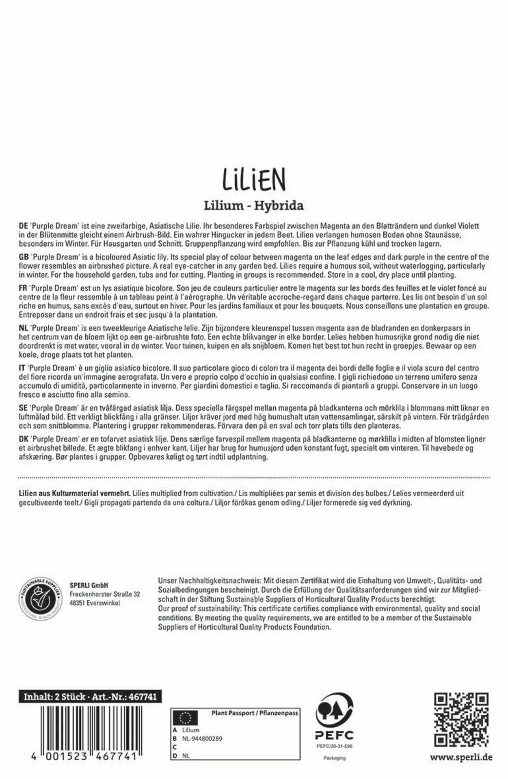 Diese Lilie ist ein richtiger Blickfang in Deinem Garten! Die zweifarbige Lilie ‚Purple Dream‘ zeigt eine sehr spannende Farbkombination aus einer purpurfarbenen Blüte kombiniert mit einer fast schwarzen Mitte. Diese Sorte wächst mit vielen Blüten und ergibt daher eine große Anzahl an haltbaren Schnittblumen für Deine Vasen. An der ca. 100 cm hohen Lillie wachsen aufrechte Blüten, die den direkten Blick in die Blüte erlauben, anders als bei hängenden Sorten. Die Lilie ‚Purple Dream‘ gehört zu den nicht-duftenden Lilien und ist damit besonders beliebt bei allen, die schwere, süße Düfte weniger gerne mögen. Diese Lilie lässt sich leicht im Garten anbauen. Im Juni und Juli werden Dich die Blüten mit ihrer intensiven Farbe beeindrucken. Diese Sorte zieht zudem Nützlinge an, denn die Lilie ist eine wertvolle Nahrungsquelle für Insekten.