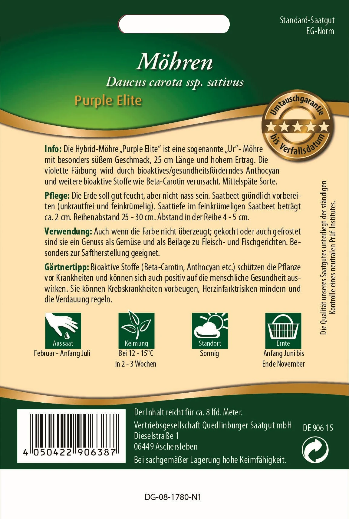 Die Hybrid-Möhre ,,Purple Elite“ ist eine sogenannte ,,Ur“ – Möhre mit besonders süßem Geschmack, 25 cm Länge und hohem Ertrag. Die violette Färbung wird durch bioaktives/gesundheitsförderndes Anthocyan und weitere bioaktive Stoffe wie Beta-Carotin verursacht. Mittelspäte Sorte.
