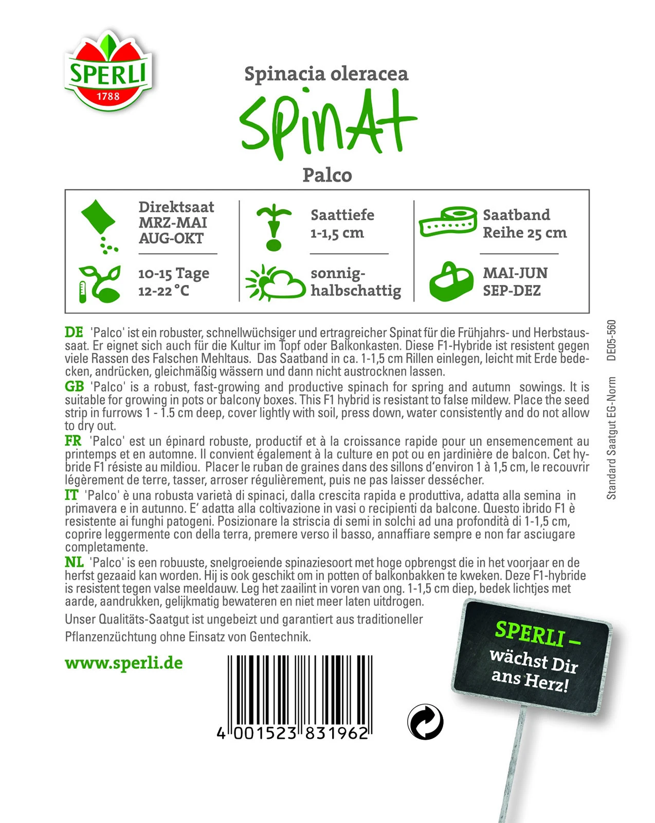 robuster, schnellwüchsiger und ertragreicher Spinat für die Frühjahrs – und Herbstaussaat. Diese F1 – Hybride ist resistent gegen Falschen Mehltau.