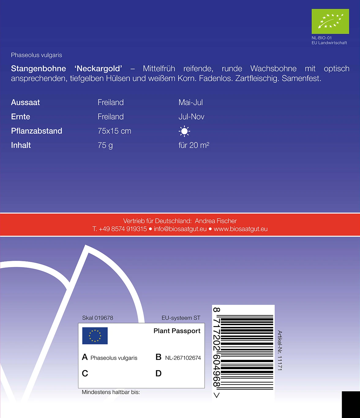 Mittelfrüh reifendem runde Wachsbohne mit optisch ansprechenden, tiefgelben Hülsen und weißem Korn. Fadenlos. Zartfleischig. Samenfest.