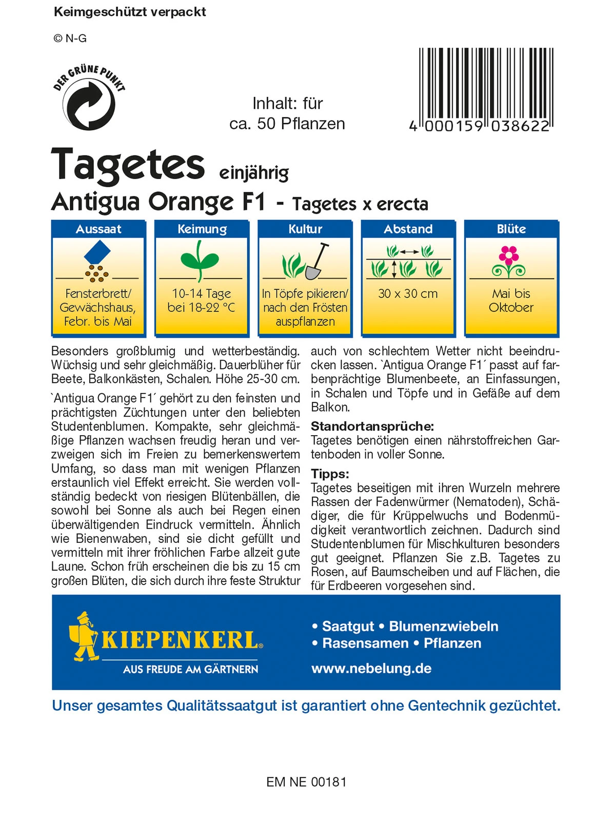 Diese Sorte gehört zu den feinsten und prächtigsten Züchtungen unter den beliebten Studentenblumen. Kompakte, sehr gleichmäßige Pflanzen wachsen freudig heran und verzweigen im Freien zu bemerkenswertem Umfang, so dass man mit wenigen Pflanzen erstaunlich viel Effekt erreicht. Sie werden vollständig bedeckt von riesigen Blütenbällen, die sowohl bei Sonne als auch bei Regen einen überwältigenden Eindruck vermitteln. Schon früh erscheinen die bis zu 15 cm großen Blüten, die sich durch ihre feste Struktur auch von schlechtem Wetter nicht beeindrucken lassen. Antigua Orange F1 passt auf farbenprächtige Blumenbeete, an Einfassungen, in Schalen und Töpfe und in Gefäße auf dem Balkon.