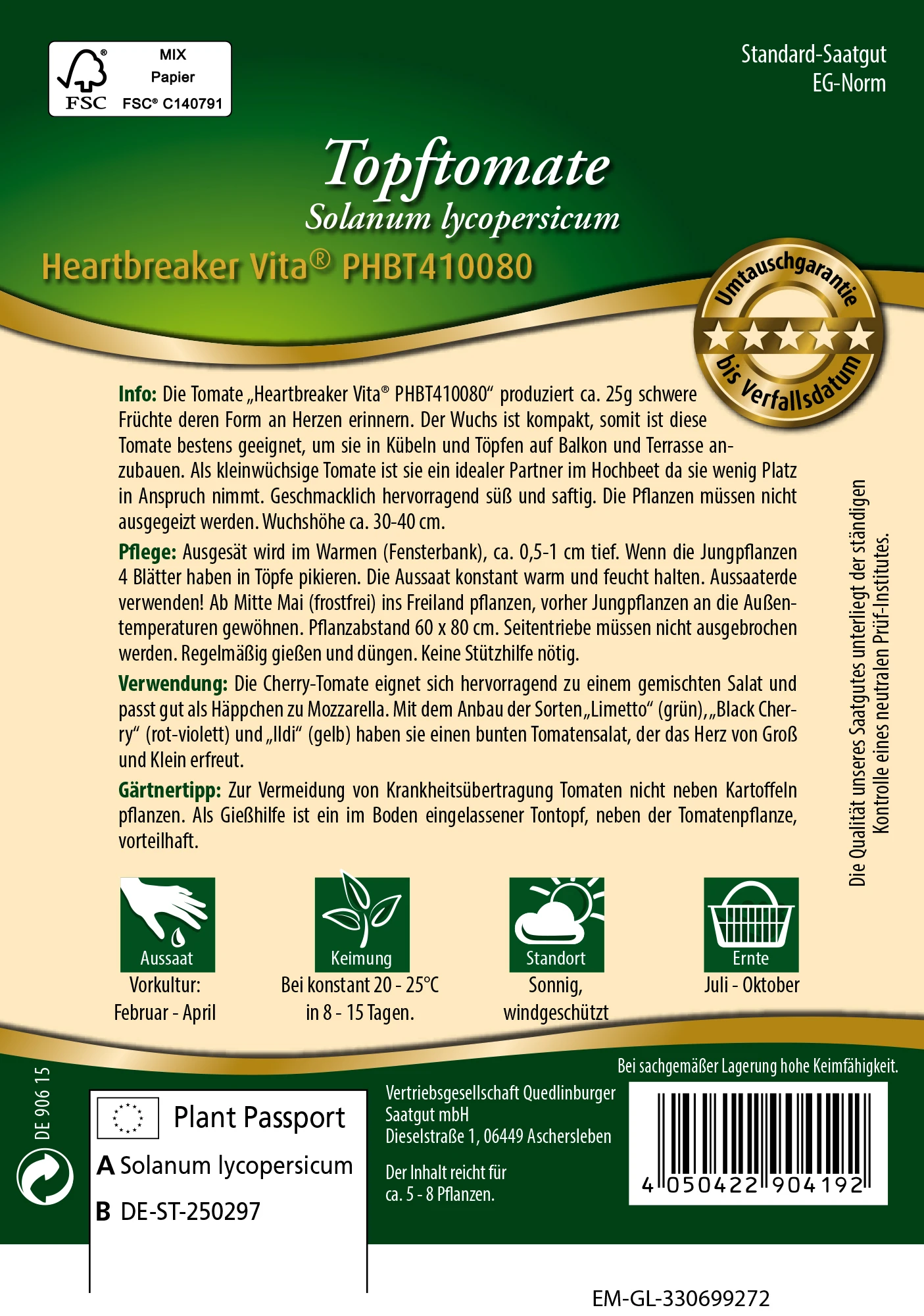 Die Tomate „Heartbreaker Vita ® PHBT410080“ produziert ca. 25g schwere Früchte deren Form an Herzen erinnern. Der Wuchs ist kompakt, somit ist diese Tomate bestens geeignet, um sie in Kübeln und Töpfen auf Balkon und Terrasse anzubauen. Als kleinwüchsige Tomate ist sie ebenso ein idealer Partner im Hochbeet da sie wenig Platz in Anspruch nimmt und Früchte bequem geerntet werden können. Geschmacklich hervorragend süß und saftig. Die Pflanzen müssen nicht ausgegeizt werden. Wuchshöhe ca. 30-40 cm.