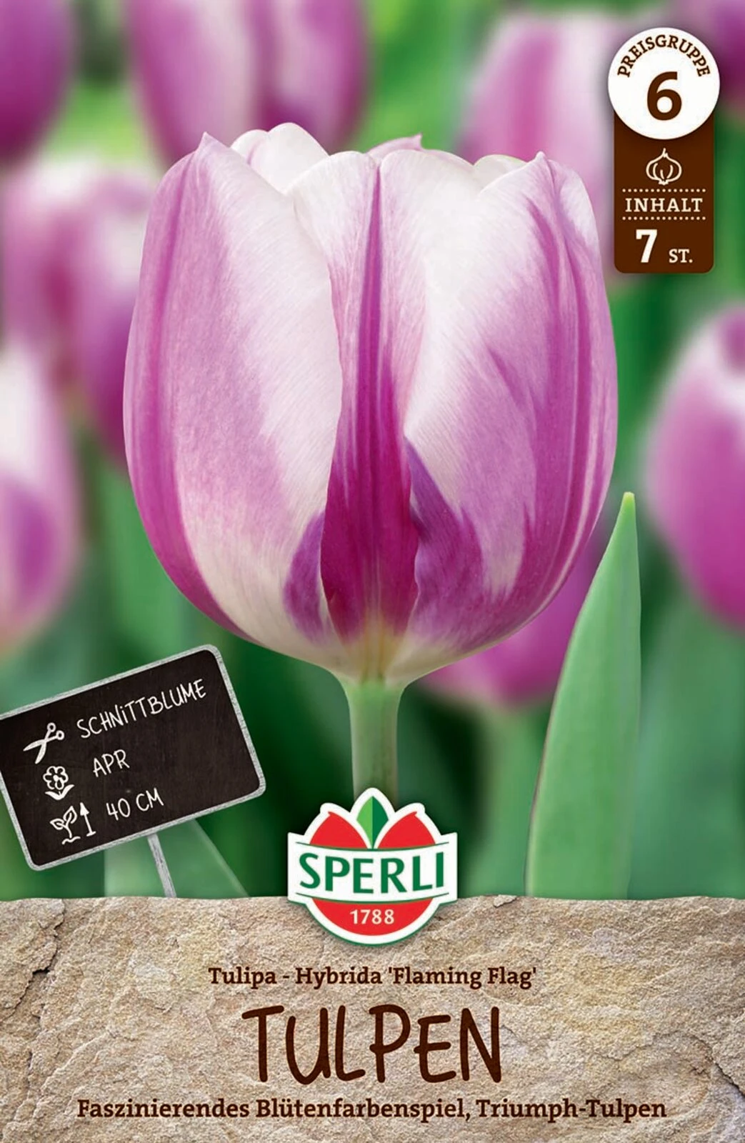 Lila Flammen auf weißem Grund zeichnen diese zweifarbige Tulpe aus. Für Hausgarten und zum Schnitt. Gruppenpflanzung wird empfohlen.Trocken und luftig lagern.