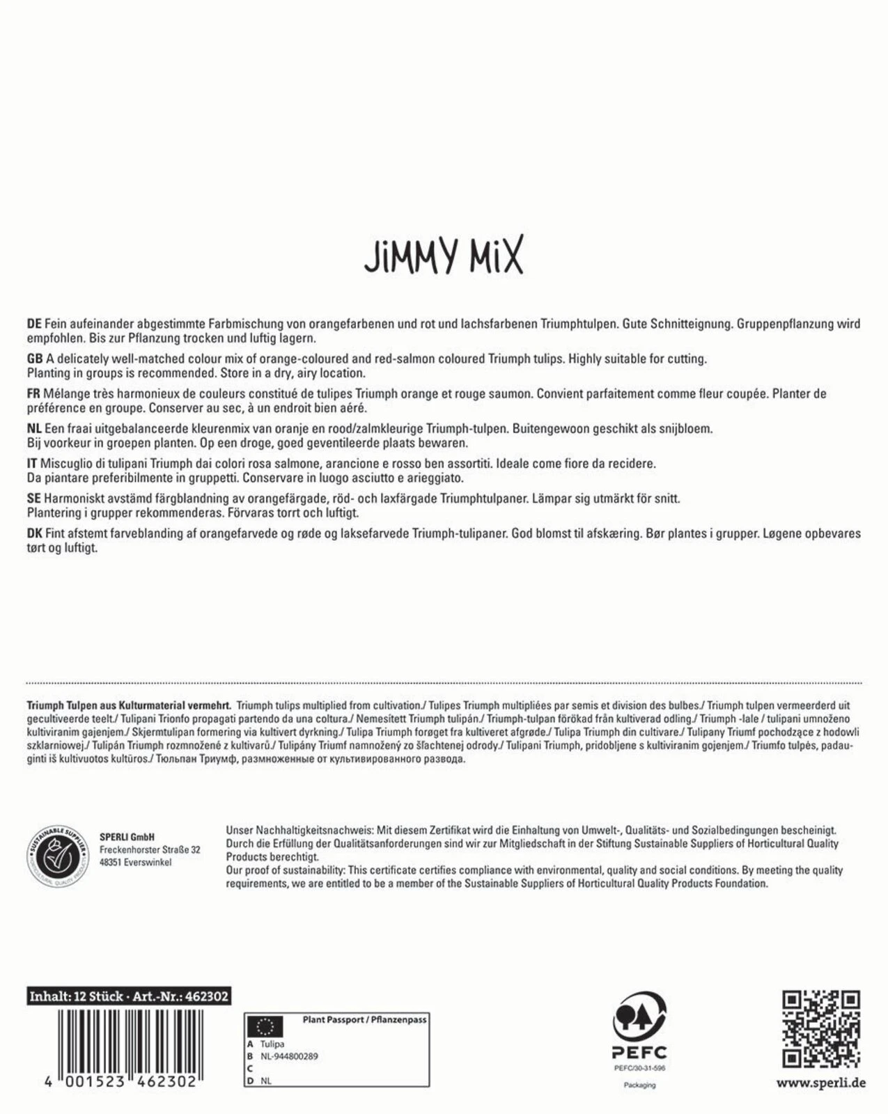 Was für eine toll aufeinander abgestimmte Tulpen-Mischung! Mit der Maxi-Packung für Triumph-Tulpen „Jimmy Mix“ ziehen traumhaft schöne Tulpen in den Farben Orange, Lachs, Rosa und Rot in Deinen Garten ein. Die Schönheiten fühlen sich nicht nur in Deinen Beeten wohl. Auch für Kübel sind die Sorten geeignet. Da diese Triumph-Tulpen langanhaltende Schnittblumen abgeben, kannst Du sie in der Blütezeit im April und Mai auch schneiden. So ergibt sich ein toller Strauß von Tulpen, deren Farben ideal harmonieren. Benannt wurde diese Mischung nach der zuerst gezüchteten Sorte ‚Jimmy‘, die orangene Blüten ziert.