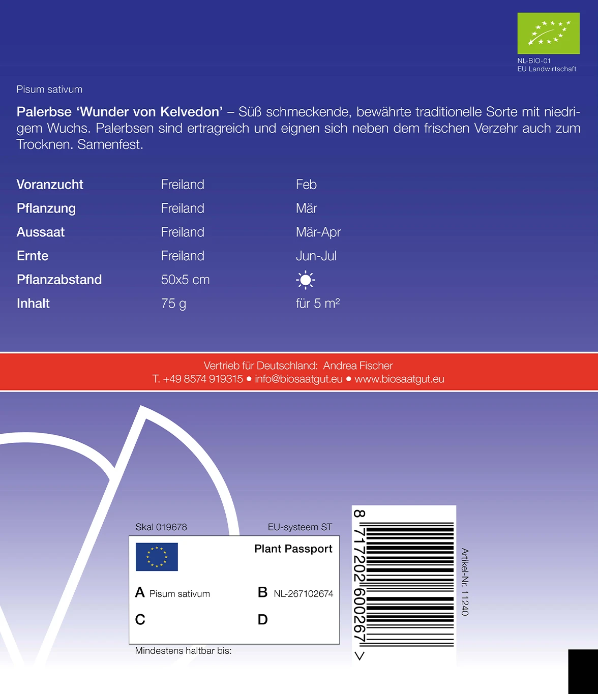 Süß, schmeckende, bewährte traditionelle Sorte mit niedrigem Wuchs. Palerbsen sind ertragreich und eignen sich neben dem frischen Verzehr auch zum Trocknen. Samenfest.